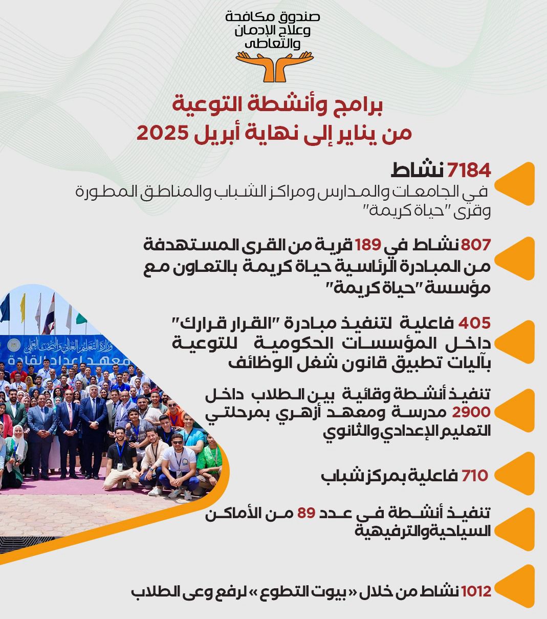 نشر صندوق مكافحة وعلاج الإدمان والتعاطى انفوجراف على الصفحة الرسمية للصندوق " الفيس بوك " استعرض خلاله أنشطة وبرامج التوعية على مدار الثلث الأول من عام 2025 وذلك في الفترة من بداية يناير وحتى نهاية إبريل