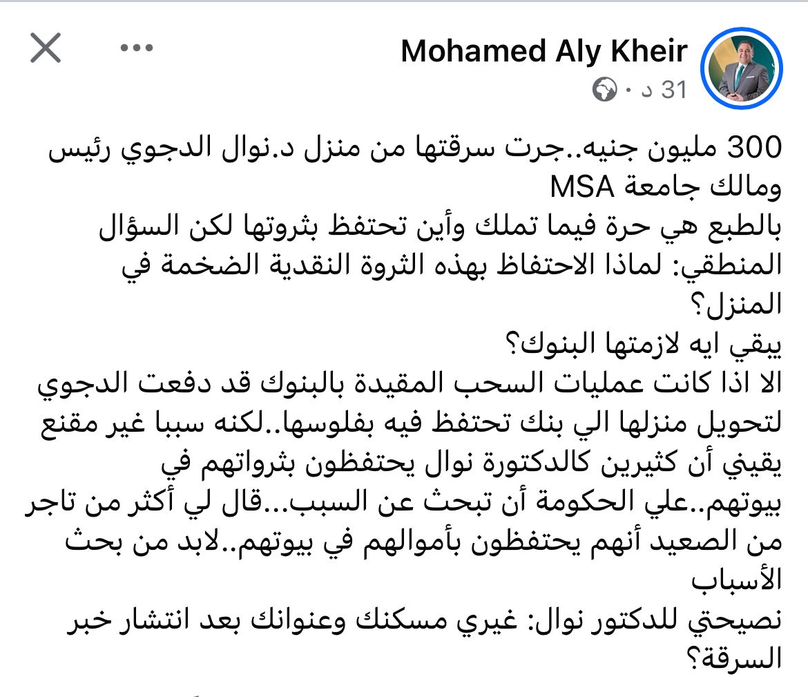 وكتب خير عبر حسابه الرسمي على موقع التواصل الاجتماعي الفيسبوك: “300 مليون جنيه.. جرت سرقتها من منزل د. نوال الدجوي رئيس ومالك جامعة MSA”.