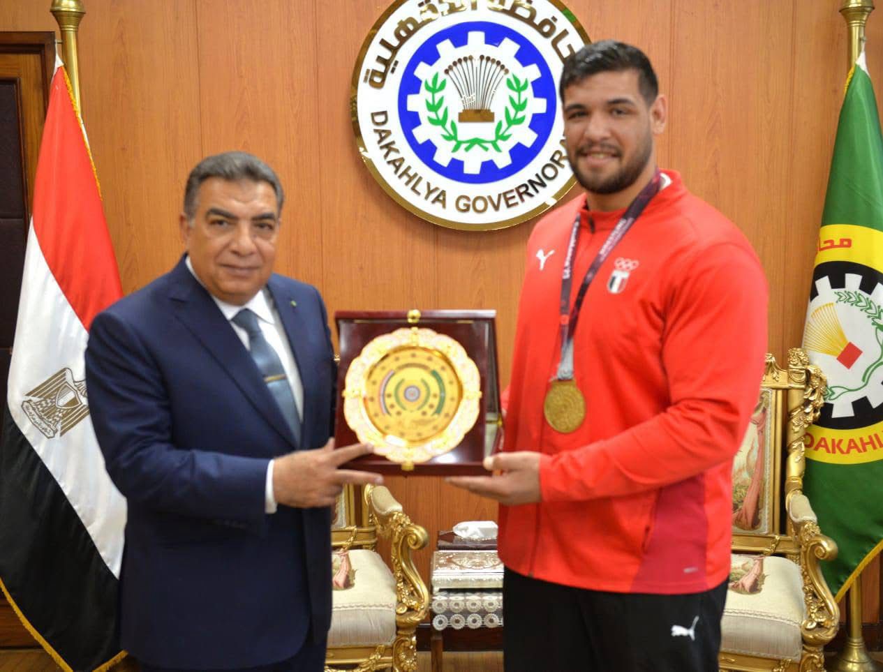 أهدى " مرزوق" للبطل درع المحافظة، تقديرًا لما حققه من إنجازات مشرفة رفعت اسم مصر عاليًا في المحافل الدولية.