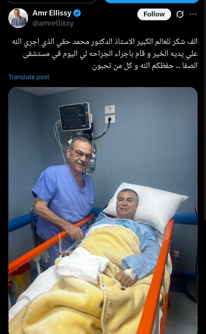 ونشر الإعلامي عمرو الليثي على منصة x: "ألف شكر للعالم الكبير الاستاذ الدكتور محمد حقي الذي اجري الله علي يديه الخير و قام بإجراء الجراحة لي اليوم في مستشفى الصفا .. حفظكم الله و كل من تحبون"