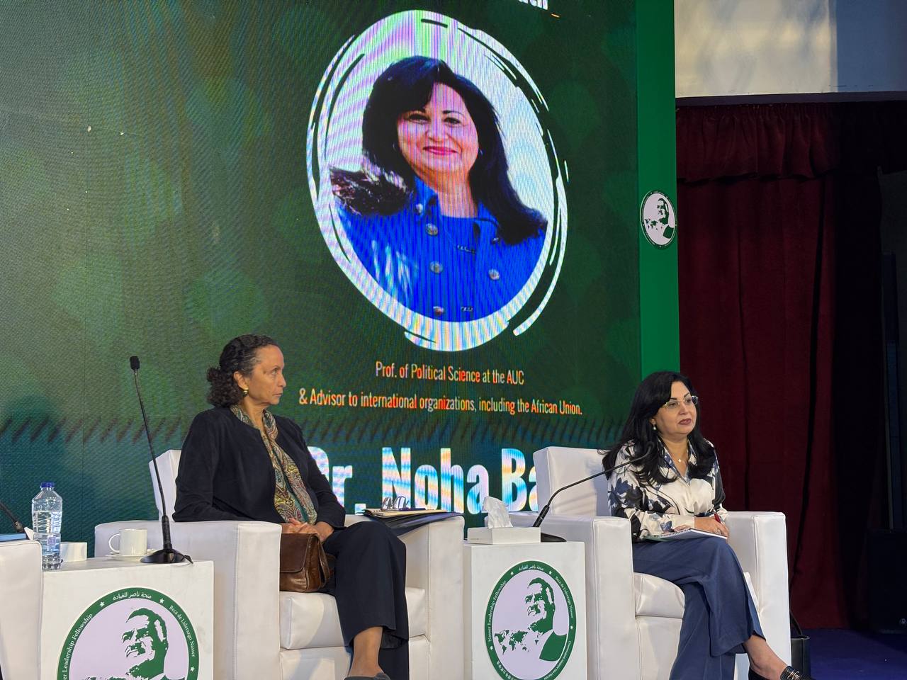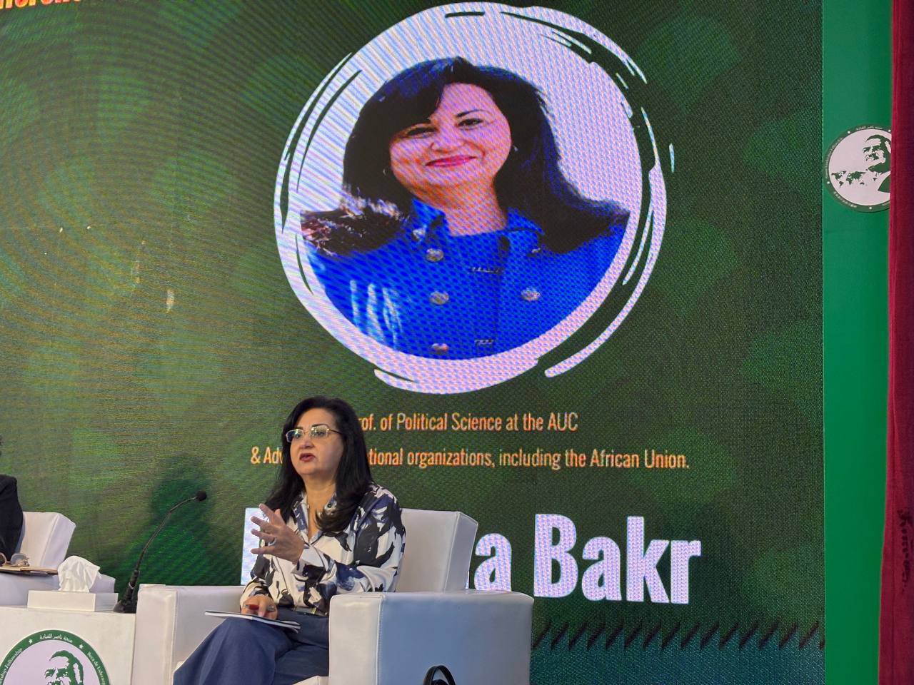 حاضر بالجلسة، دكتورة نهى المكاوي عميدة كلية الشئون الدولية والسياسات العامة بالجامعة الأمريكية بالقاهرة، ودكتورة نهي بكر أستاذ العلوم السياسية في الجامعة الأمريكية بالقاهرة ومستشار للمنظمات الدولية، بما في ذلك الاتحاد الأفريقي.