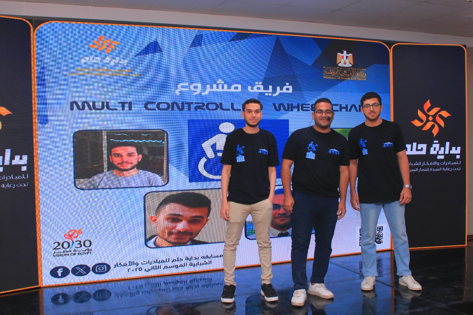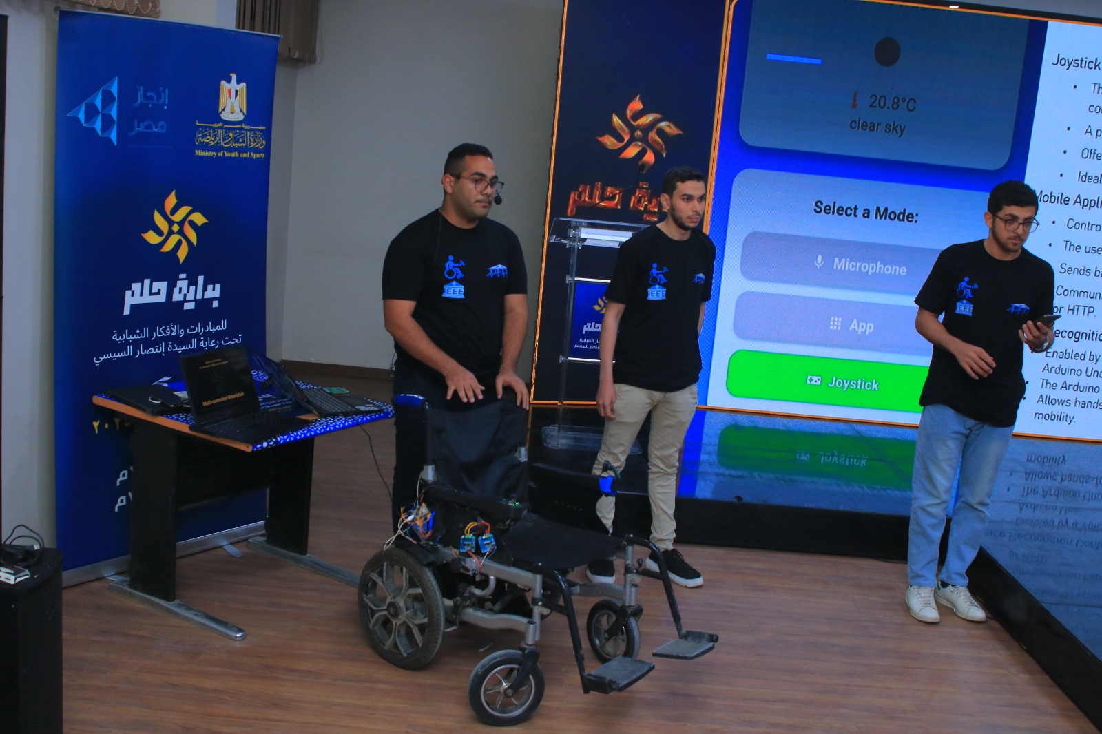 فيما تنافست أمام لجنة التحكيم فكرة "Multi-controlled Wheelchair" لدعم ذوي الإعاقات الحركية مثل الشلل النصفي والسفلي، من خلال دمج أوضاع مختلفة للتحكم: عصا التحكم (Joystick)، تطبيق موبايل (Mobile Application)، أوامر صوتية (Voice Recognition)، ومستقبلاً التحكم بالإشارات الدماغية (Brain Sensor) ، مما يوفر حلًا مبتكرًا وآمنًا من خلال استخدام التكنولوجيا، ويمكن المستخدم من التنقل بسهولة واستقلالية بإستخدام تقنيات حديثة.