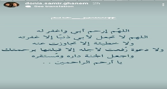 ونشرت الفنانة دنيا سمير غانم على الأستوري في موقع التواصل الاجتماعي الإنستجرام الدعاء لوالدها الراحل الفنان القدير الراحل سمير غانم: "اللهم إرحم أبي واغفر له اللهم لا تجعل لأبي ذنبا إلا غفرته ولا خطيئة إلا تجاوزت عنه ولا دعوة رفعت لأجله إلا قبلتها برحمتك واجعل الجنة داره ومستقره يا أرحم الراحمين".