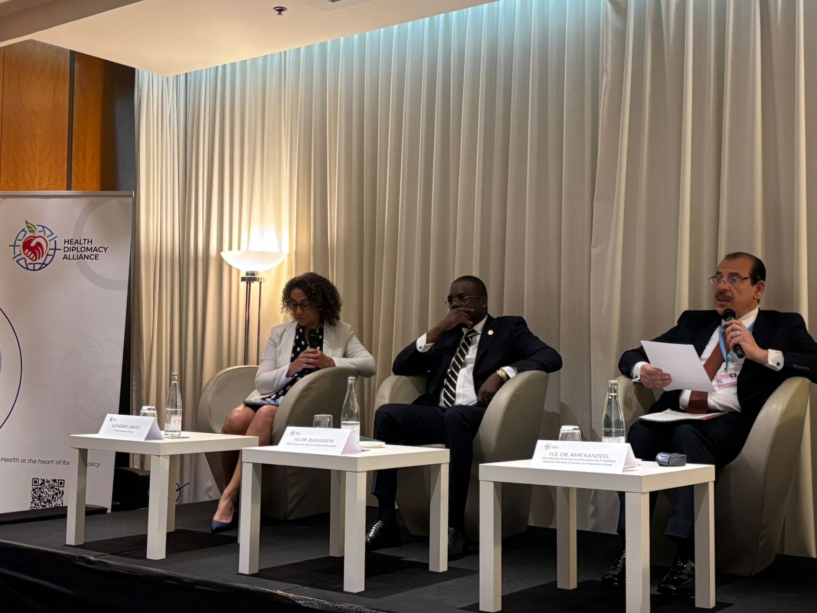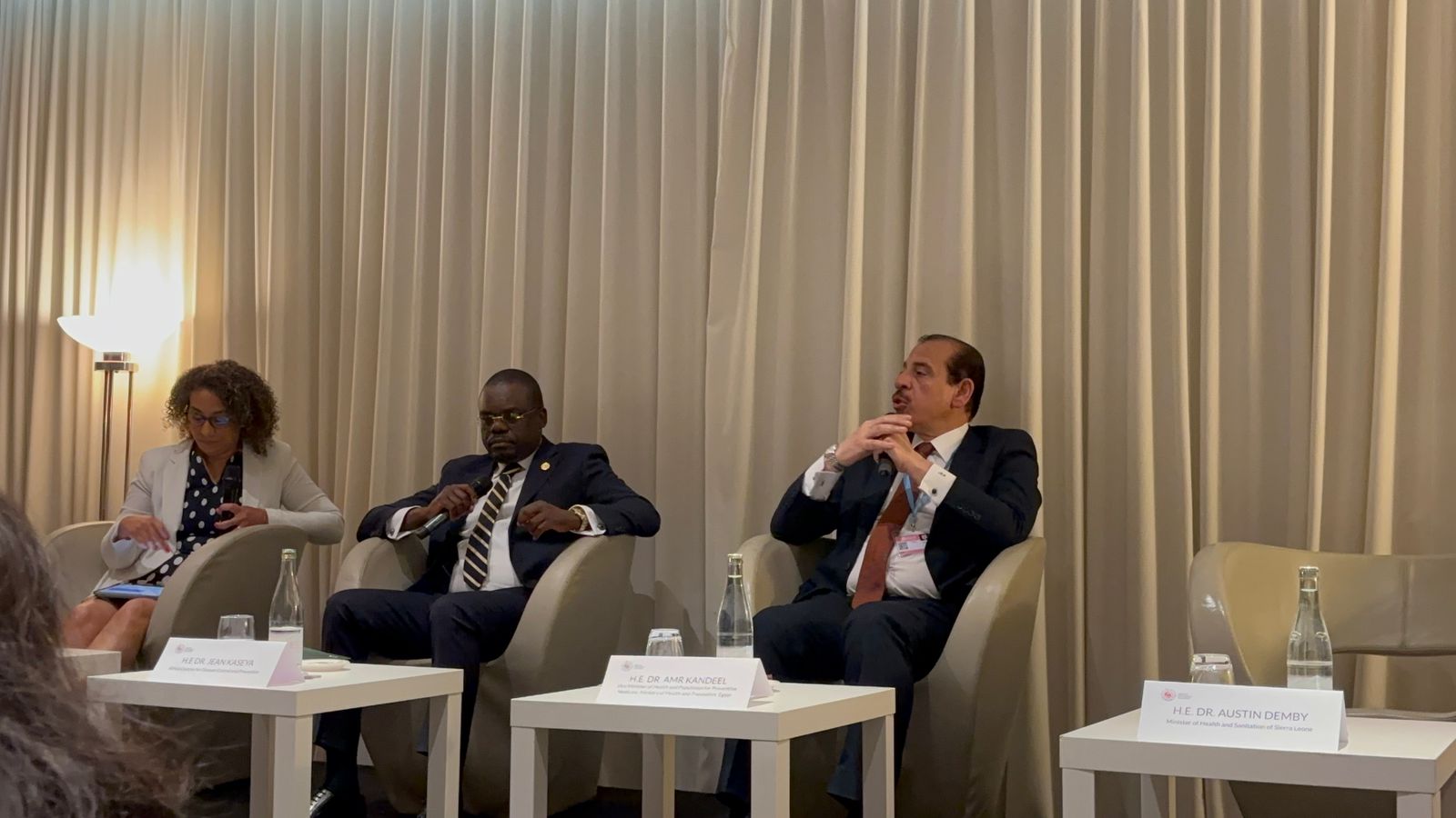 حضر الجلسة الدكتور عمرو قنديل نائب وزير الصحة، نيابة عن الدكتور خالد عبدالغفار نائب رئيس مجلس الوزراء وزير الصحة والسكان، حيث استهل كلمته بتأكيد حرص الدولة المصرية على مواصلة جهودها في بناء نظام صحي قوي وعادل، والتزامها الكامل بتأسيس نظام رعاية صحية مرن، يرتكز على التغطية الصحية الشاملة كأولوية قصوى، على الرغم من التحديات الاقتصادية العالمية والإقليمية التي أثرت على مختلف القطاعات.