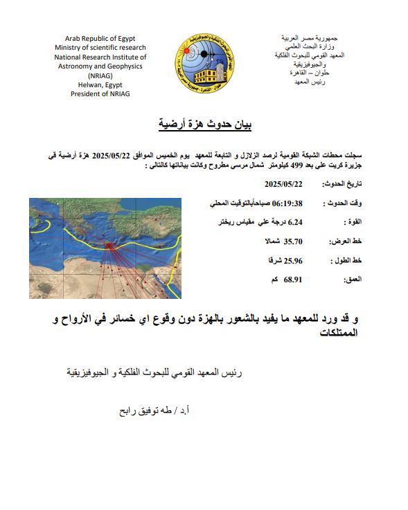 سجلت محطات الشبكة القومية لرصد الزلازل والتابعة للمعهد يوم الخميس الموافق 2025/05/22 هزة أرضية في جزيرة كريت على بعد 499 كيلومتر شمال مرسي مطروح.