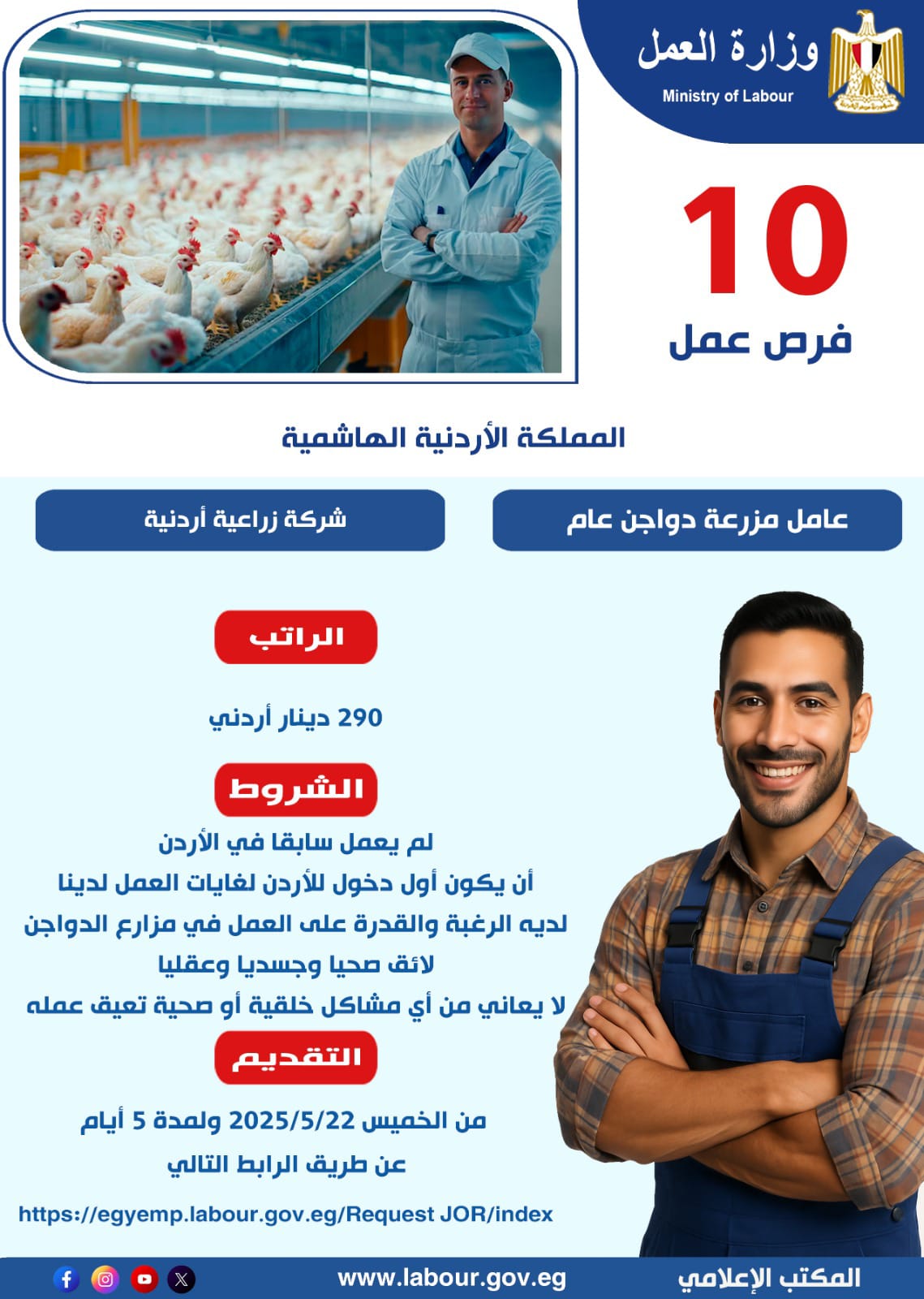 أعلنت وزارة العمل اليوم الخميس ،عن توفير 10 فُرص عمل على مهنة عامل مزرعة دواجن عام، للعمل في إحدى المؤسسات الزراعية الأردنية المتخصصة في مجال تربية الدواجن ،بالمملكة الأردنية الهاشمية.