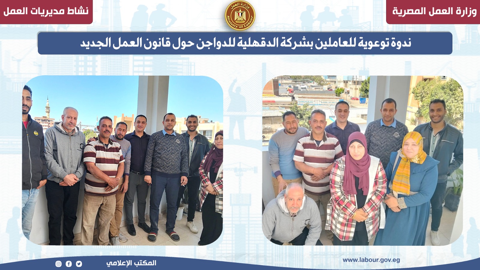 نظمت مديرية العمل بالدقهلية، من خلال مكتب عمل دماص بمنطقة عمل ميت غمر، ندوة توعوية بمقر شركة الدقهلية للدواجن، حول قانون العمل رقم 14 لسنة 2025، وذلك تنفيذًا لتوجيهات وزير العمل محمد جبران بتكثيف جهود التوعية داخل المنشآت وتعريف العاملين بحقوقهم وواجباتهم القانونية.