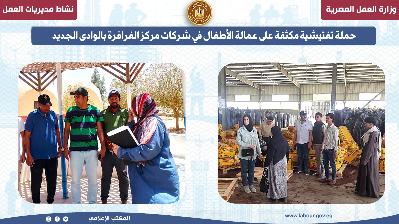نفذت مديرية العمل بالوادى الجديد، ممثلة في مكتب العمل والسلامة والصحة المهنية بالفرافرة، حملة تفتيش ميدانية على عمالة الأطفال في عدد من الشركات الاستثمارية بمركز الفرافرة، تحت إشراف مدير المديرية أحمد طليب، وبالتنسيق مع وحدة الأمومة والطفولة بالمركز، وإشراف الإدارة المركزية لرعاية القوى العاملة بوزارة العمل والإدارة العامة للطفل.