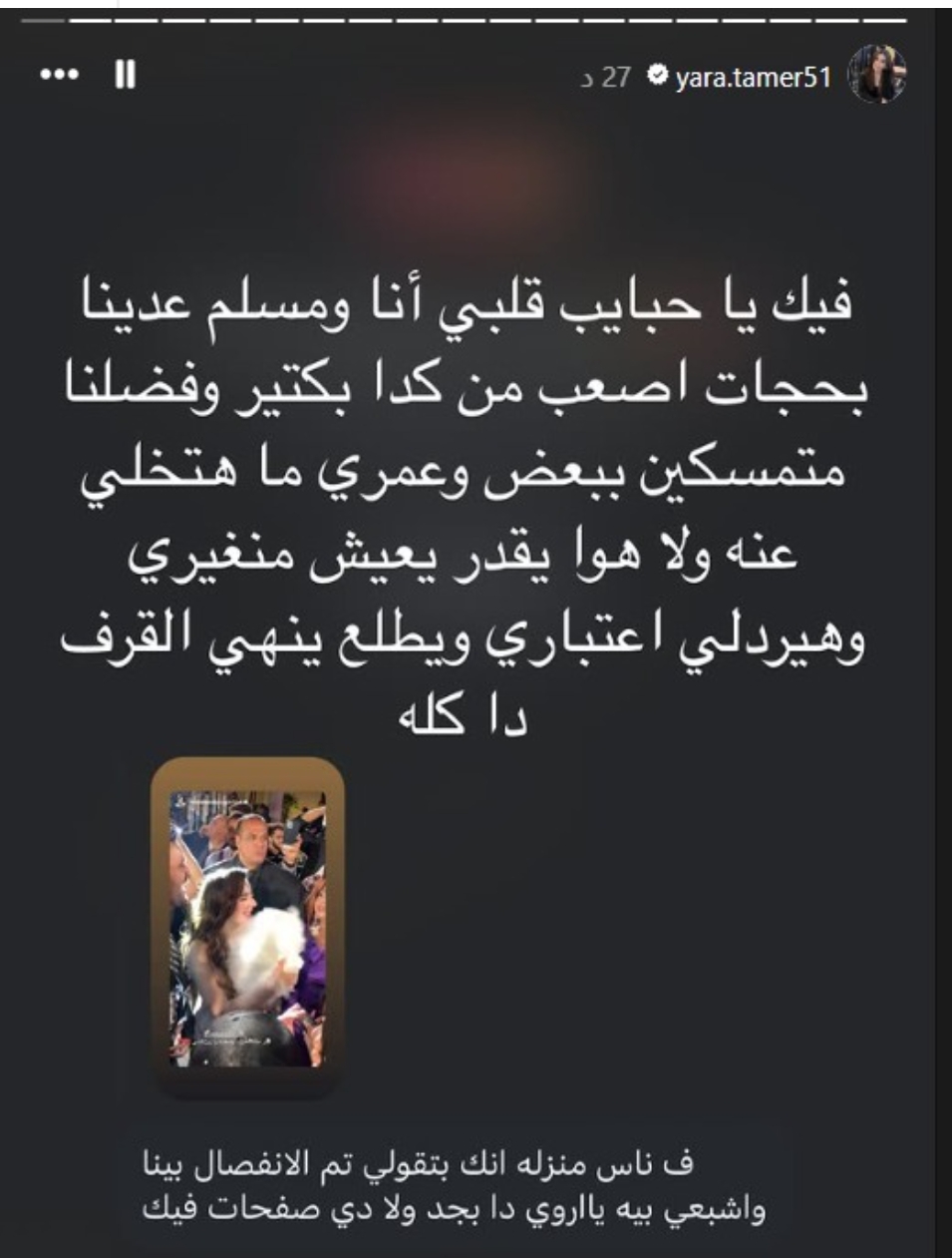 وفي فيديو لاحق على "تيك توك"، عبّرت يارا عن استيائها: "أنا عارفة جوزي كويس، بس لما بيفرح مش بيشوف، واللي فضلت ماسكة إيده أنتي بالنسبالي طفلة.. لو عندك ذرة احترام ماكنتيش نزلتي الفيديو."