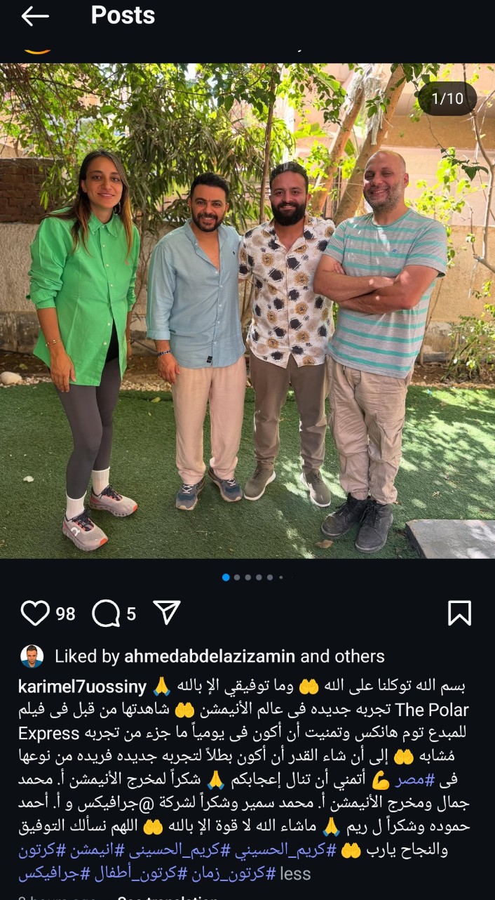 ونشر كريم الحسيني عبر حسابه على موقع التواصل الاجتماعي لتبادل الصور والفيديوهات"إنستجرام"، مجموعة صور والفيديوهات قائلاً: "بسم الله توكلنا على الله، وما توفيقي إلا بالله، تجربة جديدة في عالم الأنيميشن، شاهدتها من قبل في فيلم The Polar Express للمبدع توم هانكس، وتمنيت أن أكون يومًا ما جزءًا من تجربة مشابهة، إلى أن شاء القدر أن أكون بطلًا لتجربة جديدة فريدة من نوعها في مصر".