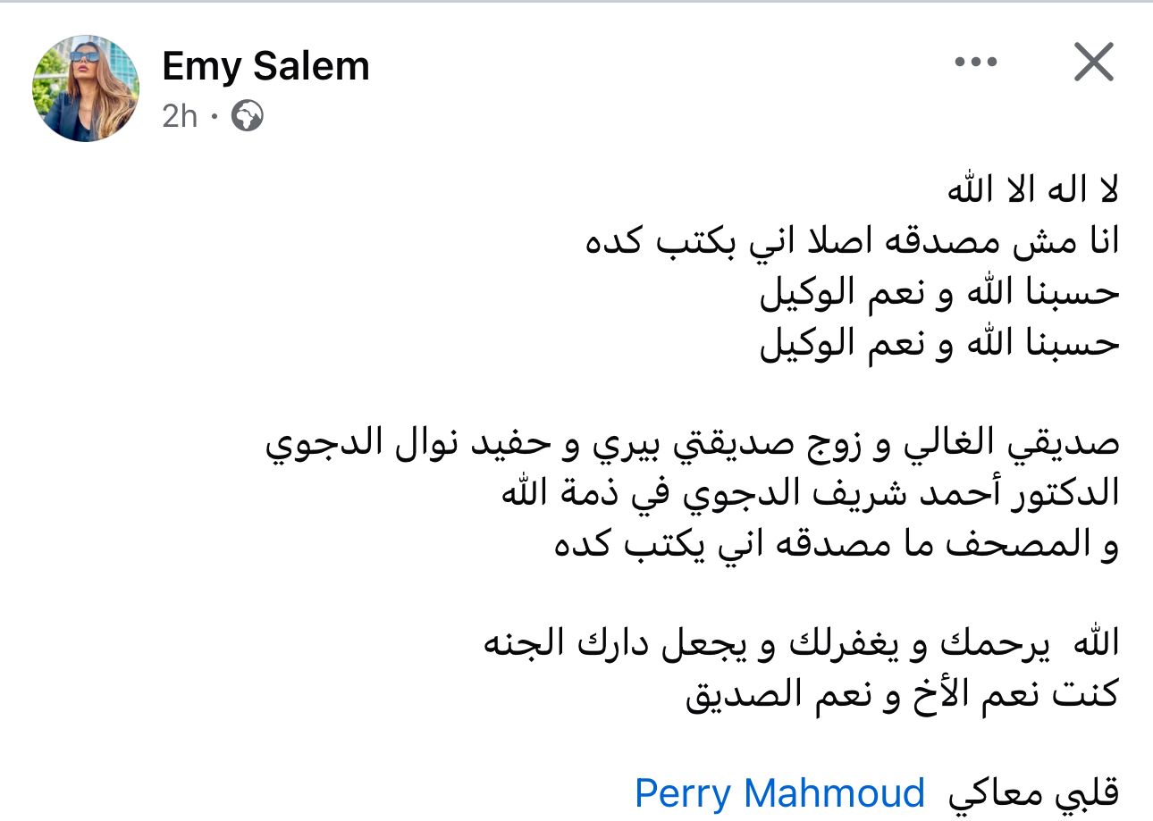 نعت الفنانة إيمي سالم، حفيد الدكتورة نوال الدجوي، بكلمات مؤثرة، عبّرت من خلالها عن حزنها العميق لفقدانه، مشيدة بأخلاقه وطيبة قلبه.