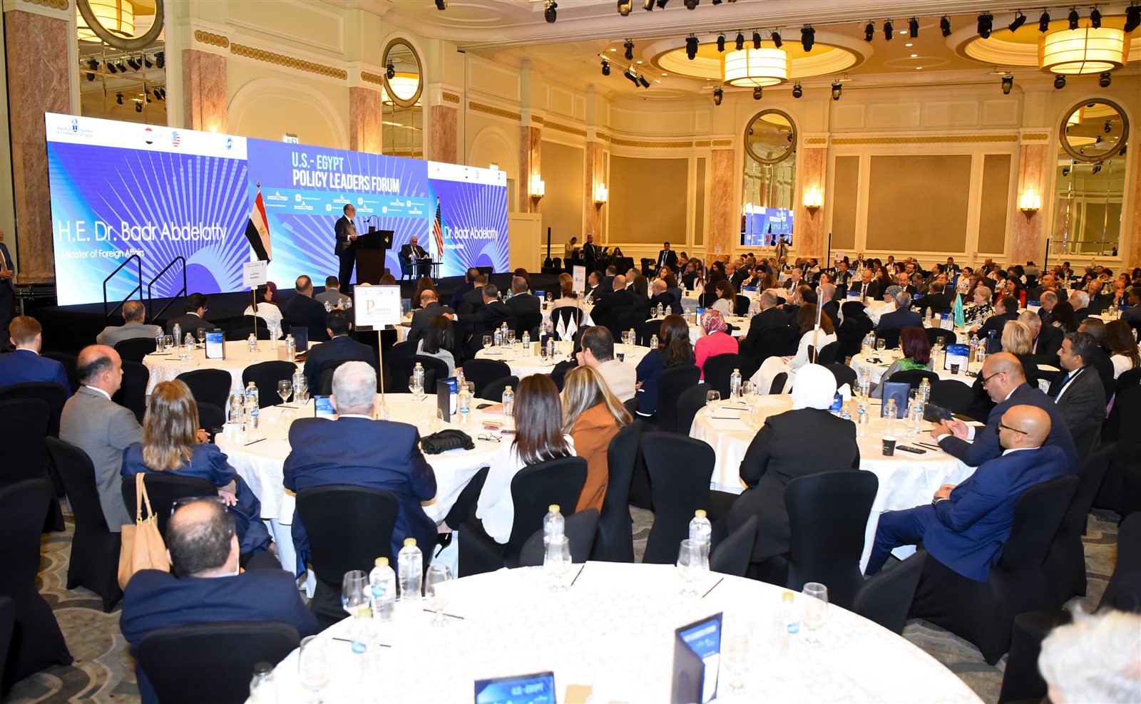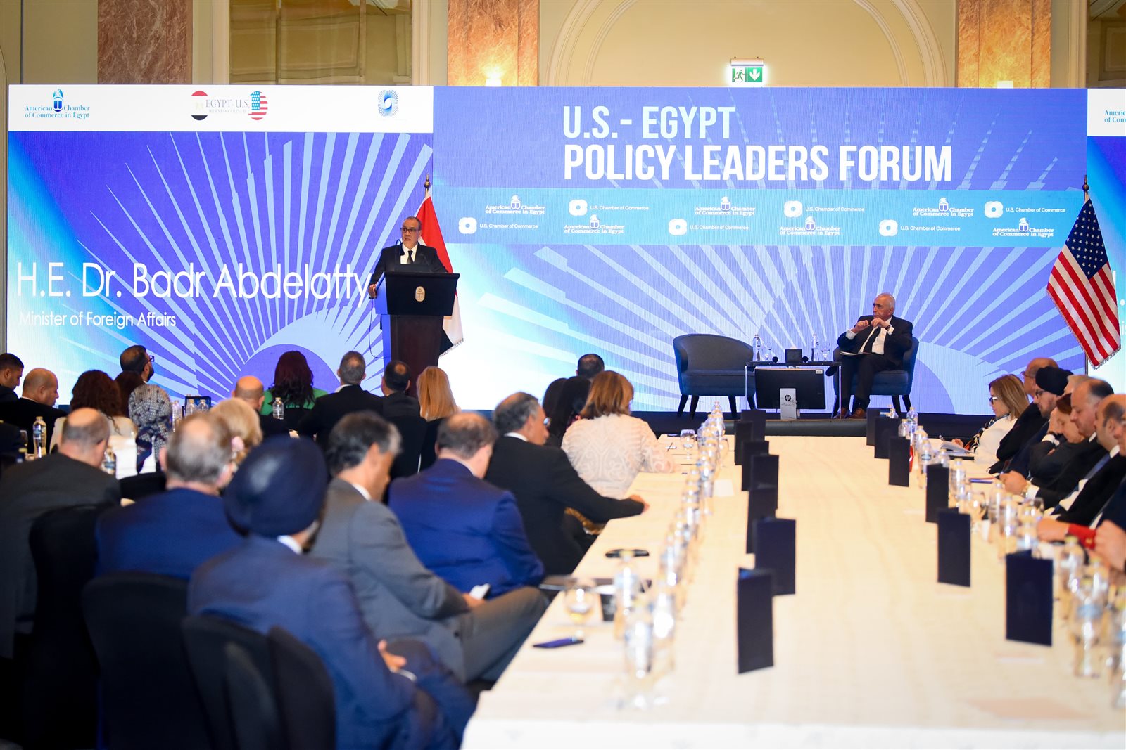 شارك الدكتور بدر عبد العاطي وزير الخارجية والهجرة يوم الاثنين 26 مايو في المنتدى الاقتصادي المصري الأمريكي لقادة السياسات الذي تستضيفه القاهرة تحت رعاية السيد رئيس الجمهورية، وبالتنسيق مع غرفة التجارة الأمريكية في واشنطن، وذلك بحضور السيدة سوزان كلارك رئيسة الغرفة، وعمر مهنا رئيس مجلس إدارة غرفة التجارة الأمريكية في القاهرة، وأكثر من 80 من الرؤساء التنفيذيين وكبار مسؤولي الشركات الأمريكية الكبرى.