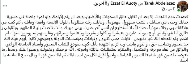 وأضاف: "لا أستطيع أن أنسى آخر حديث بيني وبينك وأنت تتحدث بنبرة المقهور وبتقولي يا طارق أنا في رقبتي أربع بيوت عايزين يعيشوا ويأكلوا ويشربوا ويتعلموا وميراثهم وفلوسهم محرومون منها، لم أشعر ولو للحظة إنك غير طبيعي، قابلت معي كثيرون وقيادات بمؤسسات الدولة وجميعهم كانوا رأيهم فيك انك حد محترم وصاحب حق".