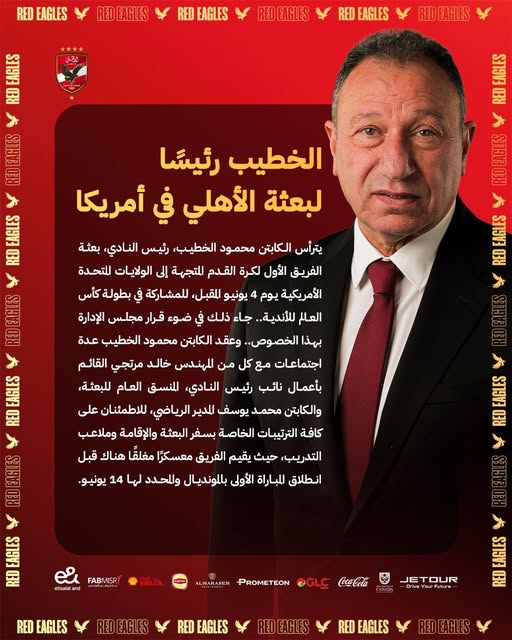 يترأس الكابتن محمود الخطيب، رئيس النادي الأهلي، بعثة الفريق الأول لكرة القدم المتجهة إلى الولايات المتحدة الأمريكية يوم 4 يونيو المقبل، للمشاركة في بطولة كأس العالم للأندية.