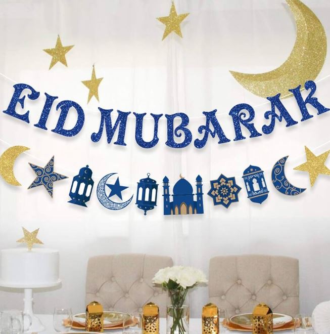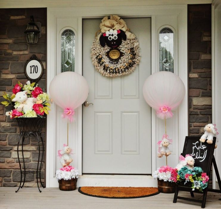 يمكن وضع طوق أو إكليل به كلمات مثل “عيد سعيد” أو صورة خروف في مدخل المنزل وتعليق إضاءات صغيرة على شكل نجوم أو فوانيس ملونة أو خروف .