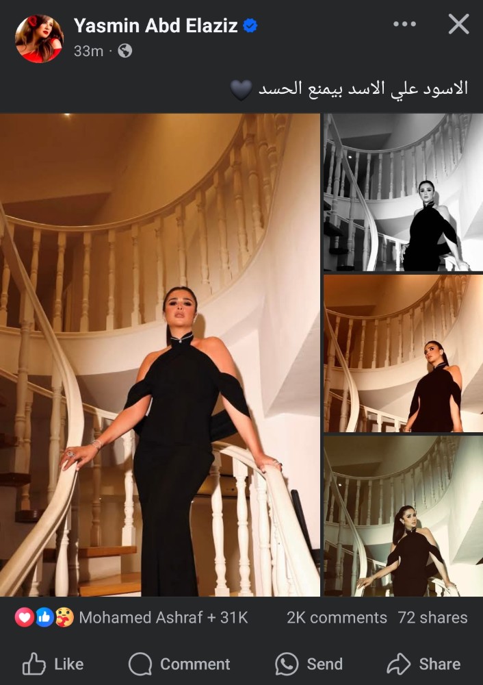 ونشرت الفنانة ياسمين عبد العزيز على موقع التواصل الفيسبوك مجموعة من الصور لها، وعلقت: “الاسود علي الاسد بيمنع الحسد”.
