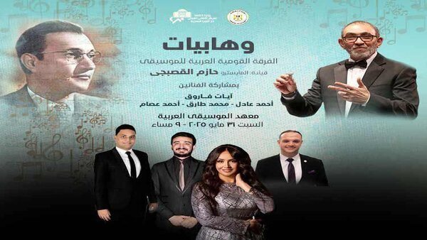 يقام حفل للفرقة القومية العربية للموسيقى بقيادة المايسترو حازم القصبجى، ضمن سلسلة وهابيات، وذلك فى التاسعة مساء السبت 31 مايو على مسرح معهد الموسيقى العربية بالأوبرا.