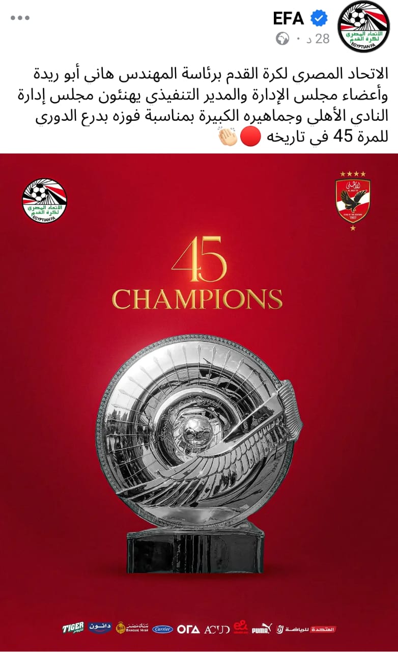الاتحاد المصري لكرة القدم برئاسة المهندس هاني أبو ريدة وأعضاء مجلس الإدارة والمدير التنفيذي يهنئون مجلس إدارة النادي الأهلي وجماهيره الكبيرة بمناسبة فوزه بدرع الدوري للمرة 45 في تاريخه .