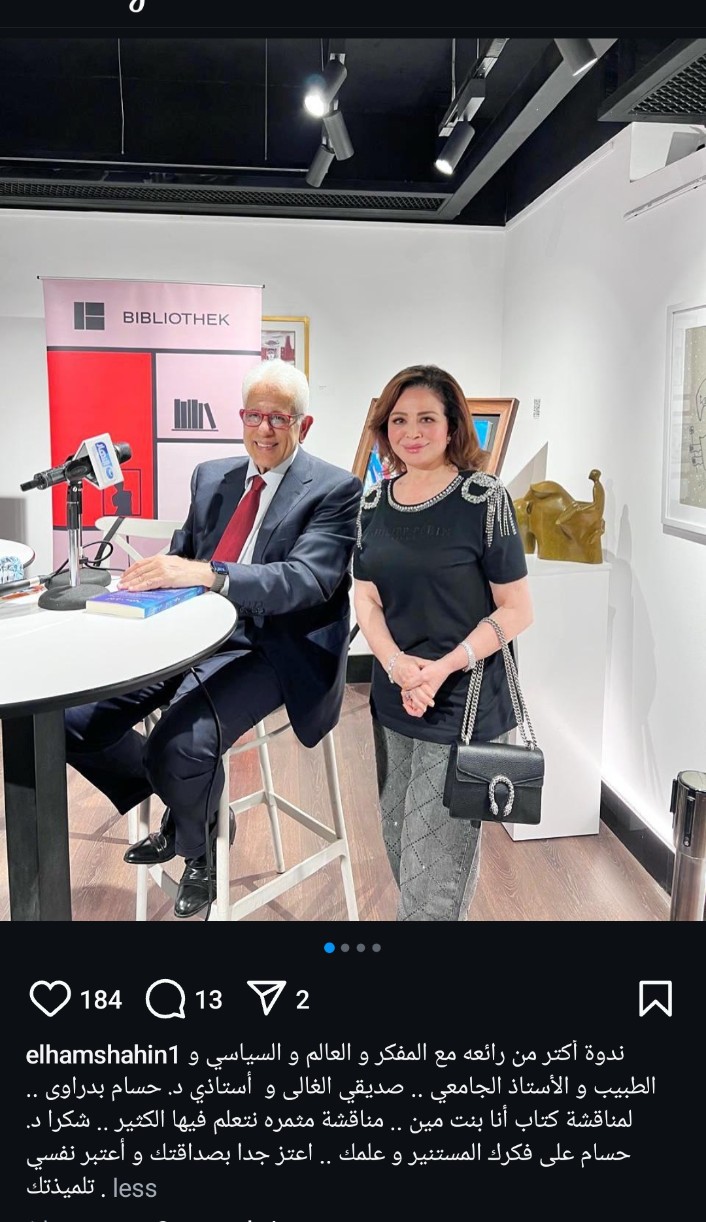 ونشر الفنان إلهام شاهين على صفحتها الرسمية على موقع التواصل الاجتماعي لتبادل الصور والفيديوهات الانستجرام: 'ندوة أكثر من رائعه مع المفكر و العالم والسياسي والطبيب و طالأستاذ الجامعي .. صديقي الغالى و أستاذي د. حسام بدراوى لمناقشة كتاب أنا بنت مين .. مناقشة مثمره نتعلم فيها الكثير .. شكرا .. حسام على فكرك المستنير و علمك .. اعتز جدا بصداقتك وأعتبر نفسي تلميذتك".