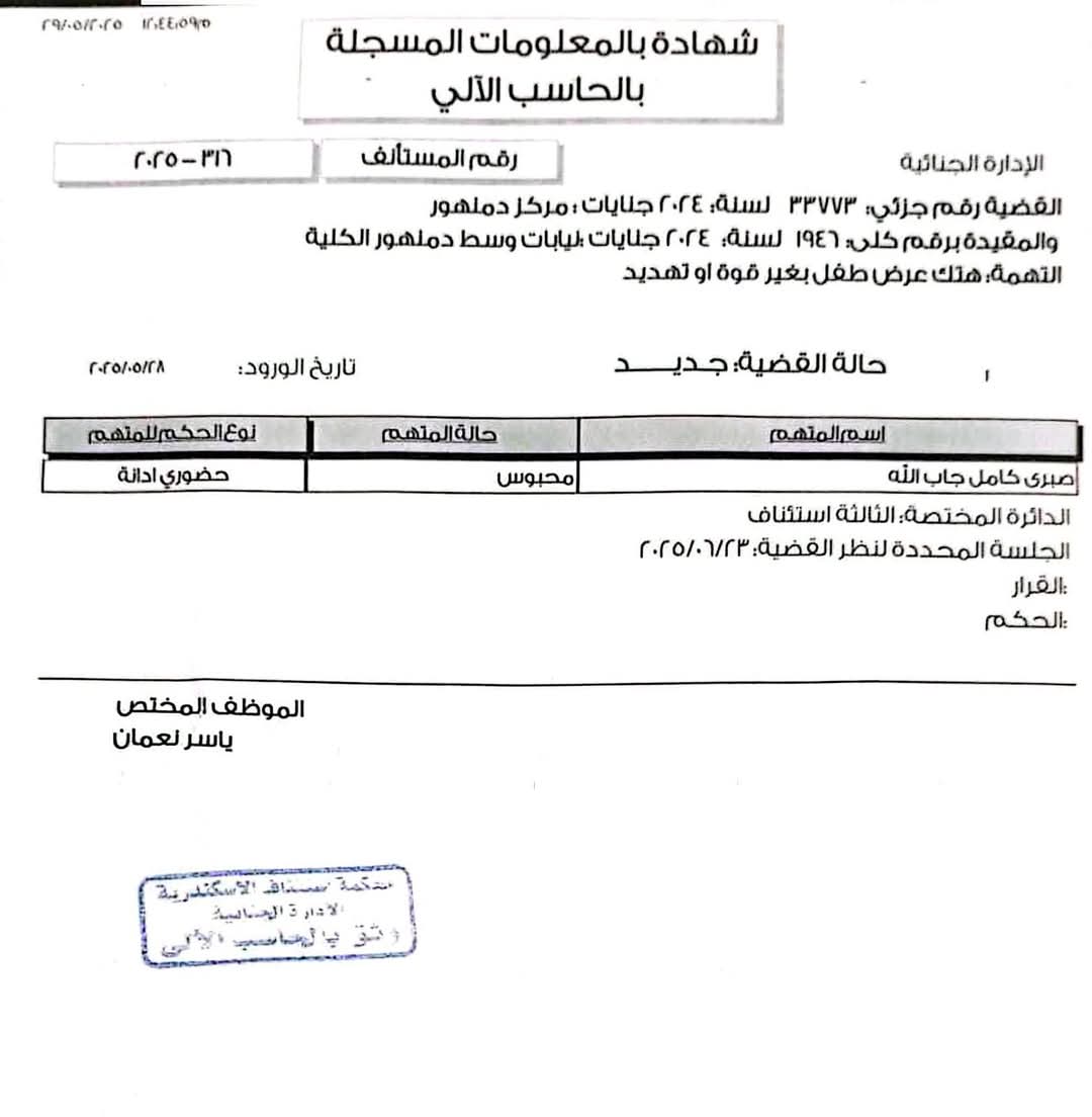 حددت محكمة الاستئناف في الإسكندرية جلسة 23 يونيو المقبل لنظر استئناف المتهم "ص.ك.ج" أمام الدائرة الثالثة بمحافظة البحيرة، وذلك في القضية المعروفة إعلاميًا بـ"قضية طفل دمنهور".