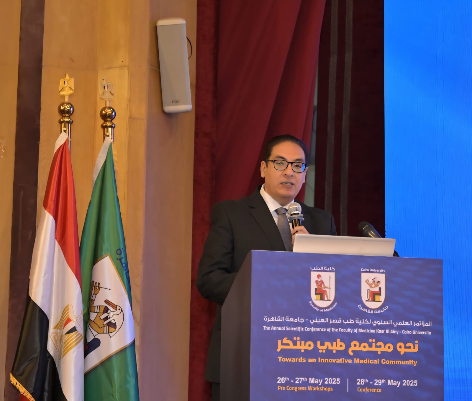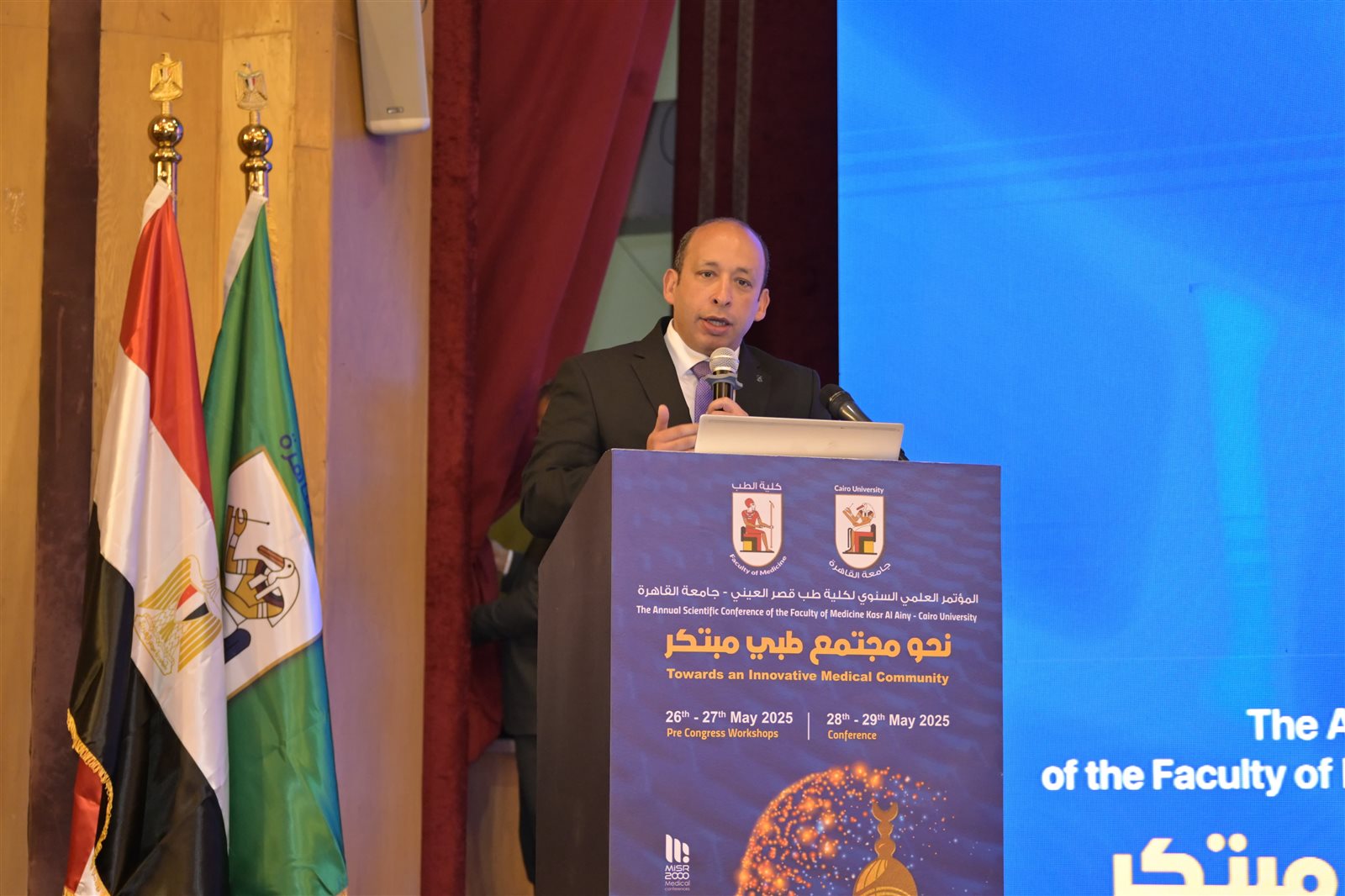 وأكد الدكتور محمد سامي عبد الصادق رئيس جامعة القاهرة، خلال كلمته، أهمية المؤتمر الذي تعقده كلية الطب والذي يتزامن مع التحولات الكُبري التي تشهدها الدولة المصرية في شتي القطاعات تحت قيادة فخامة الرئيس عبد الفتاح السيسي، وعلي رأسها قطاع الصحة والتعليم، مشيرًا إلي أن مفاهيم الجودة والابتكار والتكامل أصبحت محاور مركزية في صياغة السياسات العامة وإعادة بناء الإنسان المصري علي أسس عصرية، لافتًا إلي أن المؤتمر يحمل دعوة صريحة لتشكيل المنظومة الصحية علي أسس من الإبداع والتكامل والمعرفة العابرة للتخصصات، ومواكبة مايشهده العالم من تحولات طبية وتكنولوجية غير مسبوقة.
