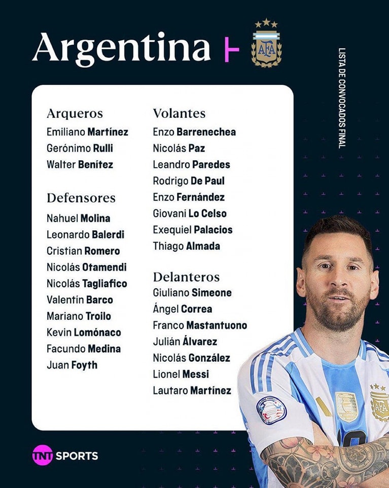 أعلن ليونيل سكالوني، المدير الفني لمنتخب الأرجنتين، القائمة الرسمية التي ستخوض معسكر التانجو خلال شهر يونيو المقبل، استعدادًا للجولتين المقبلتين من تصفيات أمريكا الجنوبية المؤهلة إلى نهائيات كأس العالم 2026. وضمت القائمة 28 لاعبًا.