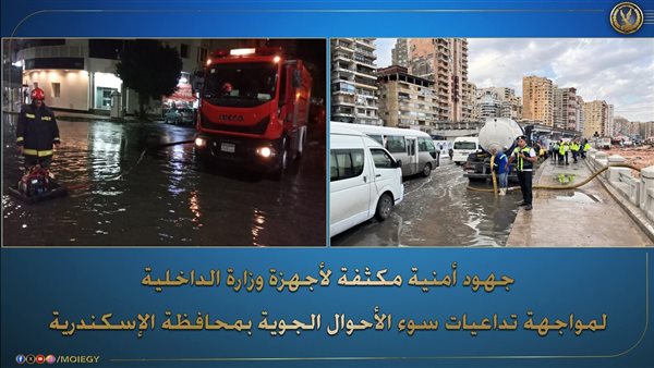 مواجهة آثار الطقس السيئ بالإسكندرية..الداخلية تدفع بسيارات إغاثة وأوناش وتُزيل تجمعات المياه