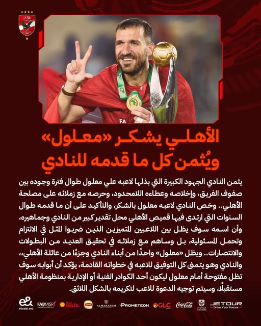 ويظل “معلول” واحدًا من أبناء النادي وجزءا من عائلة الأهلي والنادي وهو يتمنى كل التوفيق للاعبه في خطواته القادمة، يؤكد أن أبوابه سوف تظل مفتوحة أمام معلول ليكون أحد الكوادر الفنية أو الإدارية بمنظومة الأهلي مستقبلا، وسيتم توجيه الدعوة للاعب لتكريمه بالشكل اللائق.