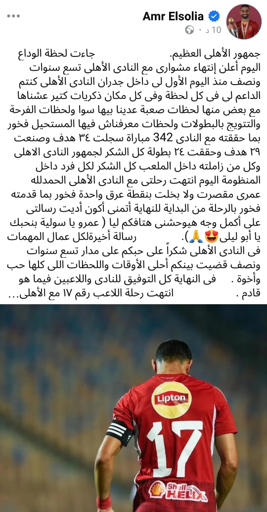 اليوم أعلن إنتهاء مشوارى مع النادى الأهلي تسع سنوات ونصف منذ اليوم الأول لي داخل جدران النادى الأهلي كنتم الداعم لي فى كل لحظة وفى كل مكان ذكريات كتير عشناها مع بعض منها لحظات صعبة عدينا بيها سوا ولحظات الفرحة والتتويج بالبطولات ولحظات معرفناش فيها المستحيل فخور بما حققته مع النادى 342 مباراة سجلت ٣٤ هدف وصنعت ٢٩ هدف وحققت ٢٤ بطولة كل الشكر لجمهور النادى الاهلي وكل من زاملته داخل الملعب كل الشكر لكل فرد داخل المنظومة اليوم انتهت رحلتى مع النادى الأهلى الحمدلله عمرى مقصرت ولا بخلت بنقطة عرق واحدة فخور بما قدمته فخور بالرحلة من البداية للنهاية أتمنى أكون أديت رسالتى على أكمل وجه هيوحشنى هتافكم ليا ( عمرو يا سولية بنحبك يا أبو ليلى