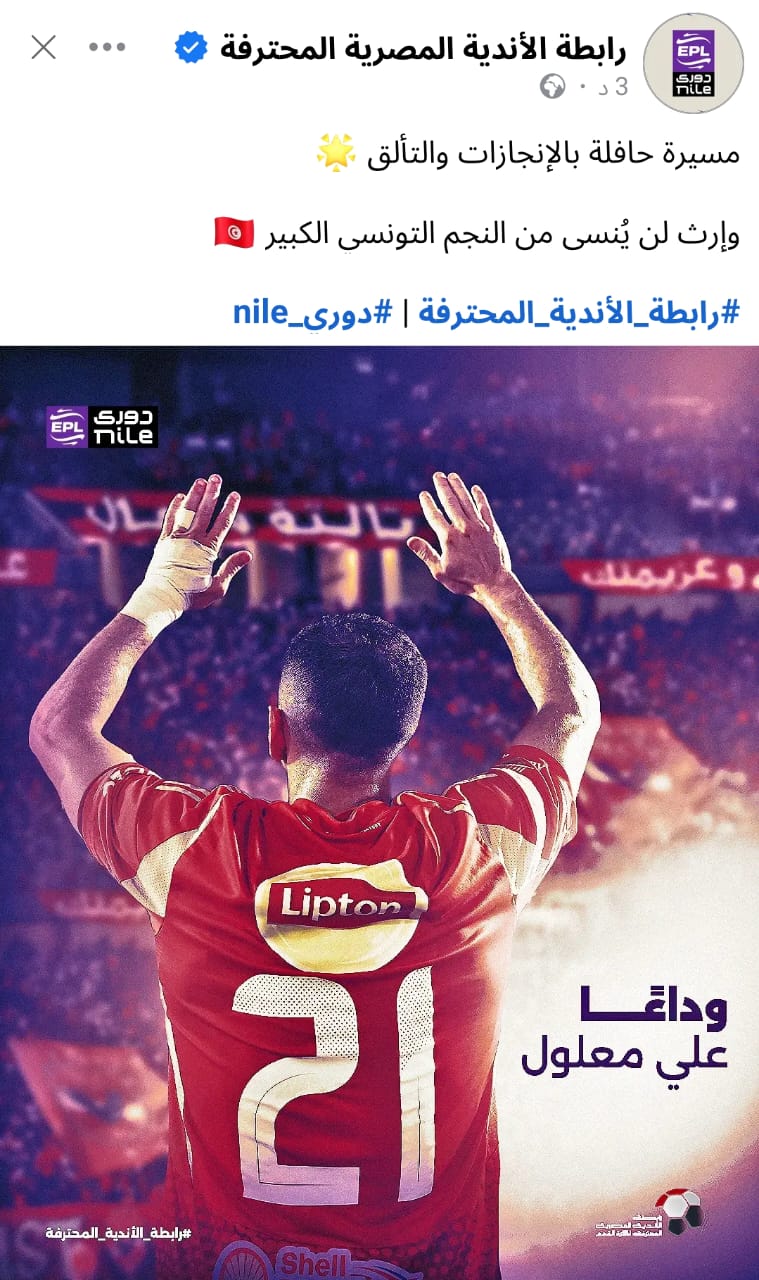 ودعت رابطة الأندية المصرية،عبر صفحتها الرسمية على فيس بوك، اللاعب التونسي علي معلول عقب رحيله عن النادي الأهلى بعد مسيرة حافلة بالإنجازات والتألق.