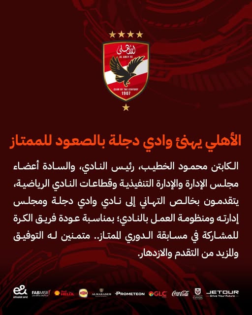 تقدم الكابتن محمود الخطيب، رئيس النادي الأهلي، والسادة أعضاء مجلس الإدارة، والإدارة التنفيذية، وقطاعات النادي الرياضية، بخالص التهاني إلى نادي وادي دجلة، ومجلس إدارته ومنظومة العمل بالنادي، بمناسبة عودة فريق الكرة للمشاركة في مسابقة الدوري المصري الممتاز.