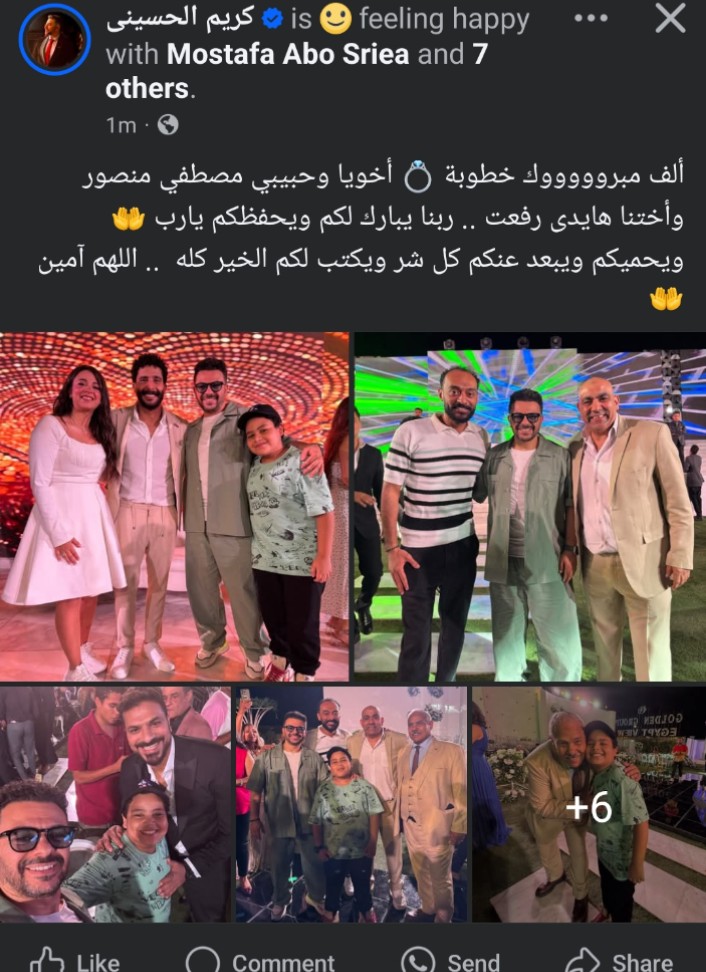 ونشر كريم الحسيني عبر حسابه الرسمي على موقع التواصل الاجتماعي الفيسبوك: "ألف مبروووووك خطوبة أخويا وحبيبي مصطفي منصور وأختنا هايدى رفعت، ربنا يبارك لكم ويحفظكم يارب ويحميكم ويبعد عنكم كل شر ويكتب لكم الخير كله، اللهم آمين".
