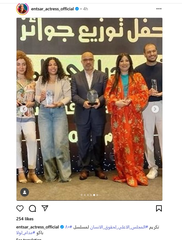 وكتبت انتصار عبر حسابها الرسمي على موقع التواصل الاجتماعي الانستجرام: “تكريم المجلس الاعلي لحقوق الانسان لمسلسل 80 باكو مدام لولا”.