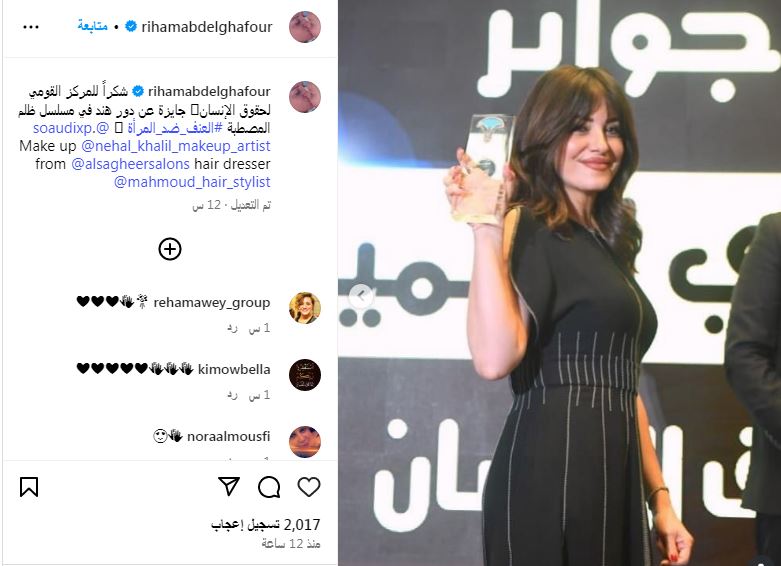 وكتبت ريهام عبر صفحتها الرسمية "إنستجرام" " شكراً للمركز القومي لحقوق الإنسان جائزة عن دور هند في مسلسل ظلم المصطبة ".
