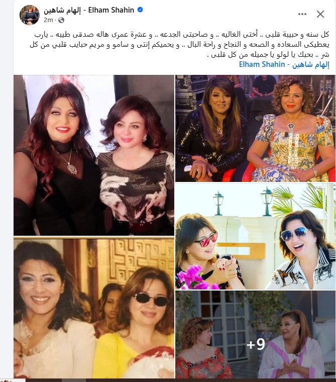 وكتبت إلهام شاهين، عبر حسابها الرسمي على موقع التواصل الإجتماعي “الفيسبوك”: "كل سنة وحبيبة قلبي، أختي الغالية، وصاحبتي الجدعة، وعشرة عمري هالة صدقي طيبة، يارب يعطيكي السعادة والصحة والنجاح وراحة البال، ويحميكم إنتى وسامو ومريم حبايب قلبي من كل شر، بحبك يا لولو يا جميلة من كل قلبي.
