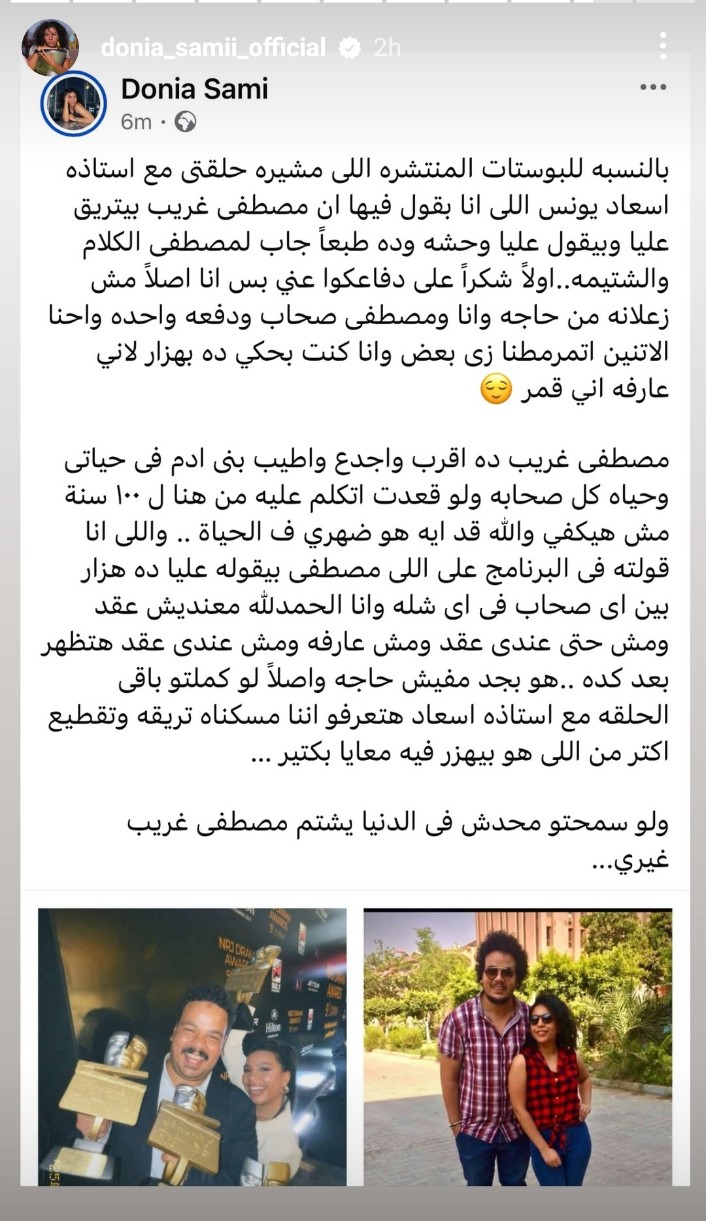 كتبت دنيا سامي منشور على حسابها الشخصي عبر موقع التواصل الاجتماعى لتبادل الصور والفيديوهات عبر خاصية الاستوري الانستجرام، “بالنسبه للبوستات المنتشره اللى مشيرو حلقتي مع أستاذه إسعاد يونس اللي أنا بقول فيها إن مصطفى غريب بيتريق عليا وبيقول عليا وحشة وده طبعاً جاب لمصطفى الكلام والشتيمه”.