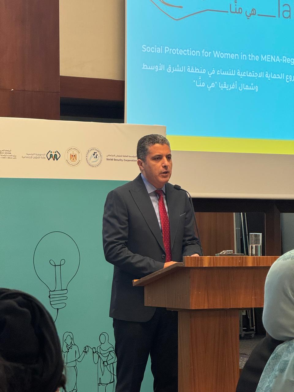 واستعرض الأستاذ رأفت شفيق مساعد وزير التضامن الاجتماعي للحماية الاجتماعية وشبكات الأمان الاجتماعي والتمكين الاقتصادي والتنمية البشرية، التجربة المصرية في منظومة الحماية الاجتماعية وأبرز ملامح قانون التأمينات الاجتماعية والمعاشات والبرامج الخاصة بالعمالة غير المنتظمة وأصحاب الحرف اليدوية والتراثية.