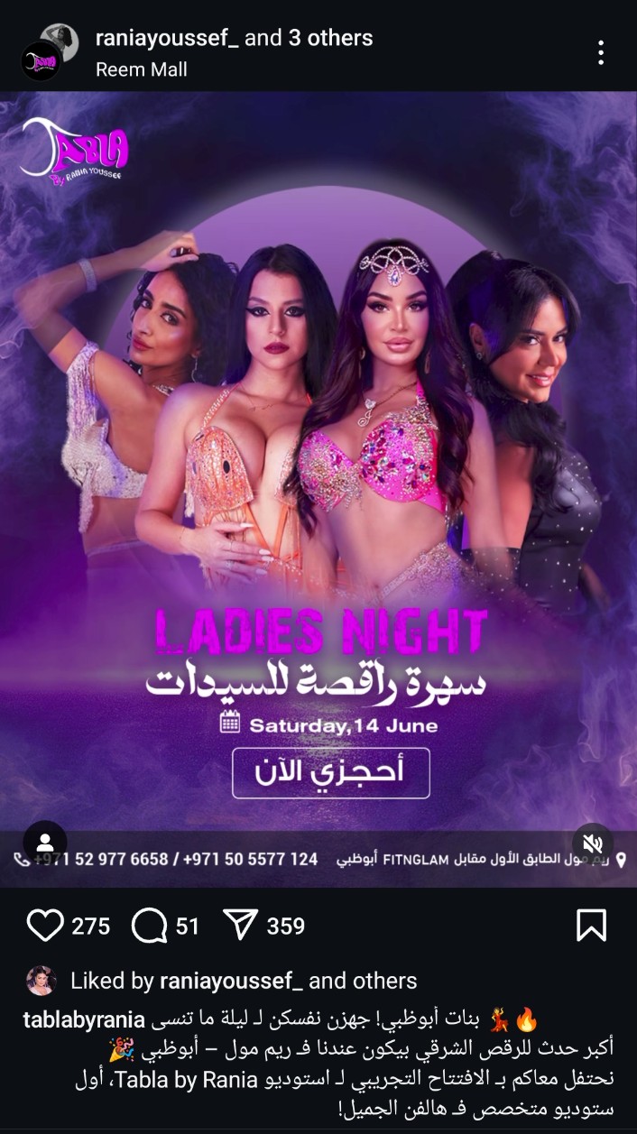 ونشرت رانيا يوسف فيديو على أغنية “أي اليوم الحلو ده” لأحمد سعد، وكتبت:"بنات أبوظبي جهزن نفسكن لـ ليلة ما تنسى، أكبر حدث للرقص الشرقي بيكون عندنا فـ ريم مول نحتفل معاكم بـ الافتتاح التجريبي لـ استوديو Tabla by Rania".