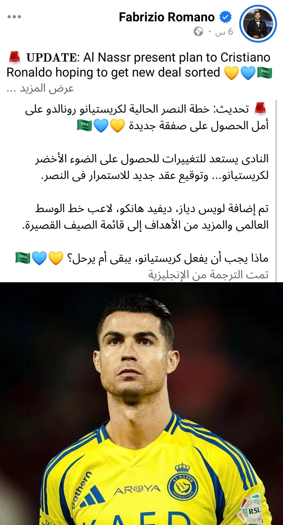 كشف الصحفي الموثوق فابريزيو رومانو أن نادي النصر السعودي قد قدم خطة جديدة للنجم البرتغالي كريستيانو رونالدو بهدف تجديد عقده والاستمرار مع الفريق في الموسم المقبل.