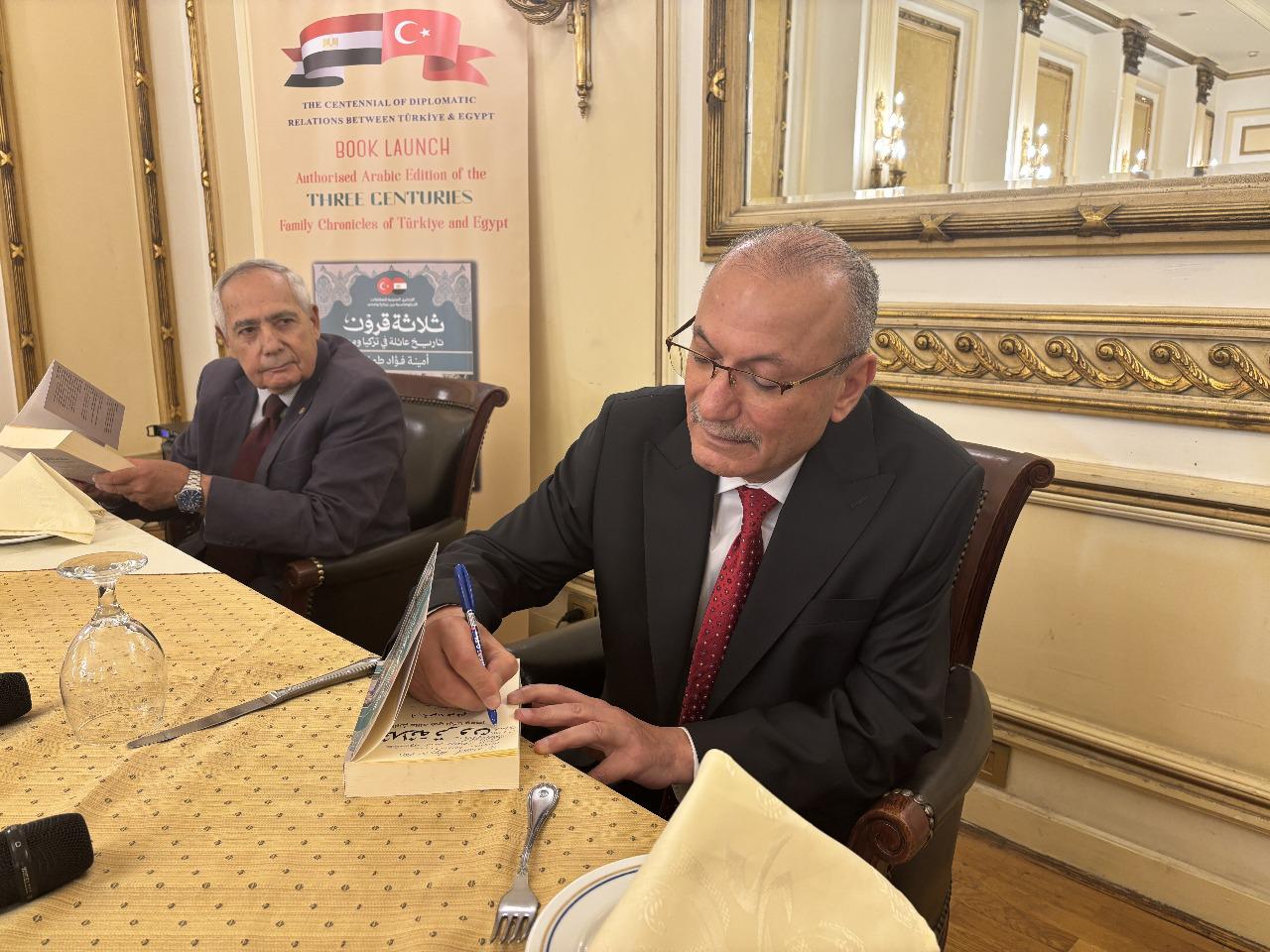 وخلال الندوة التي نظمت في نادي السيارات والرحلات المصري تم تقديم النسخة العربية من كتاب "ثلاثة قرون، تاريخ عائلة في تركيا ومصر" الذي نشر بدعم من السفير التركي بالقاهرة، صالح موطلو شن.