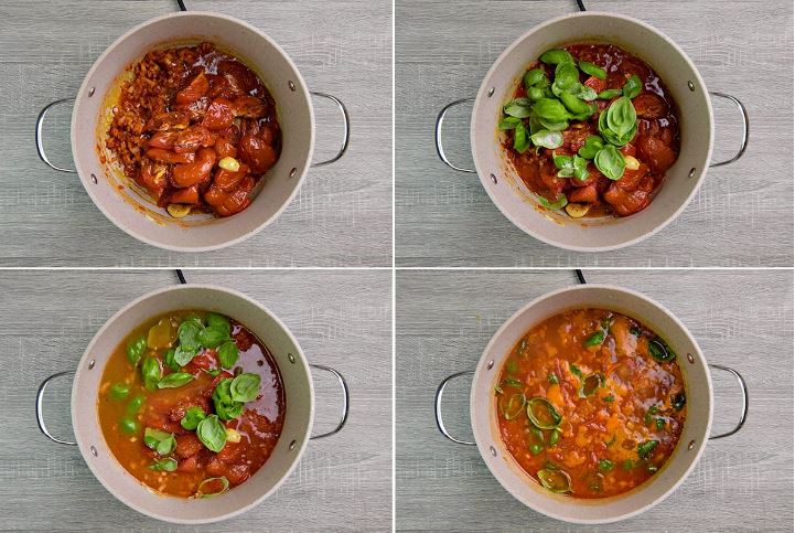 تضاف الطماطم وتطهى لمدة 10 دقائق، مع التقليب من حين إلى آخر. ثم، يضاف المرق وأوراق الريحان، وتخفض النار، وتترك لمدة 20 دقيقة. بعدها، ترفع وتترك لتبرد لمدة 15 دقيقة.
