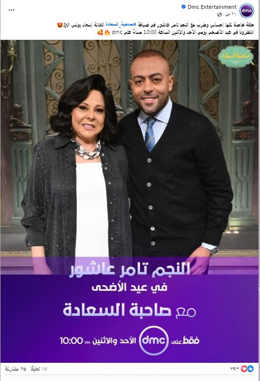 تستضيف الإعلامية إسعاد يونس في برنامجها"صاحبة السعادة "، المذاع على قناة dmc، المطرب تامر عاشور وذلك يومي الأحد والإثنين الساعة 10:00 مساءً ويتحدث خلال الحلقة عن مشواره الفني، كما يكشف عن العديد من الأسرار في حلقة مميزة وخاصة .