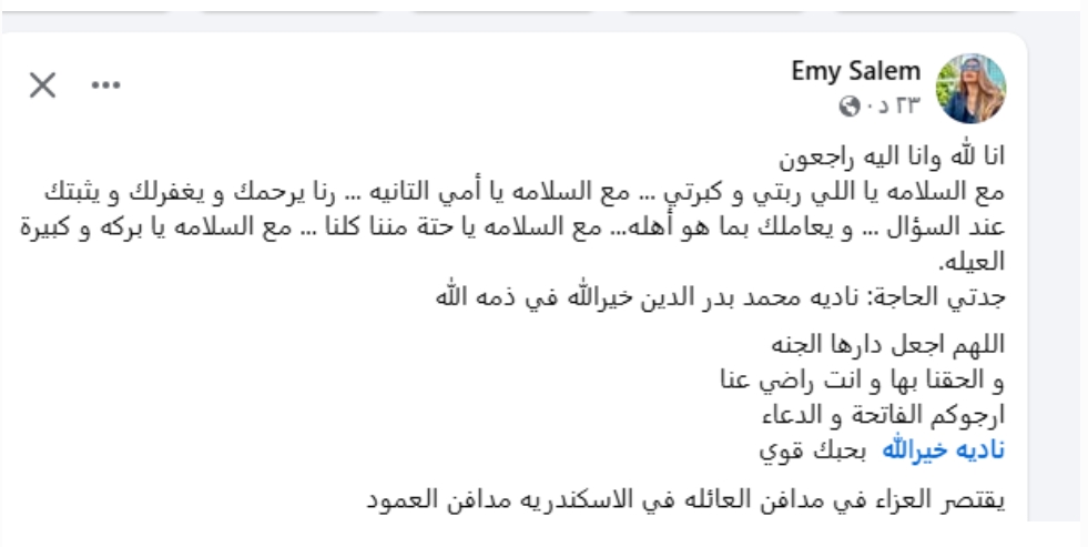"جدتي الحاجة نادية محمد بدر الدين خيرالله في ذمة الله.. اللهم اجعل دارها الجنة، والحقنا بها وأنت راضٍ عنا.. أرجوكم الفاتحة والدعاء.. نادية خيرالله.. بحبك قوي".