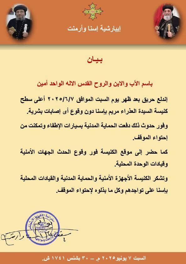 عاجل.. إيبارشية إسنا وأرمنت تصدر بياناً بشأن حريق كنيسة السيدة العذراء بالأقصر