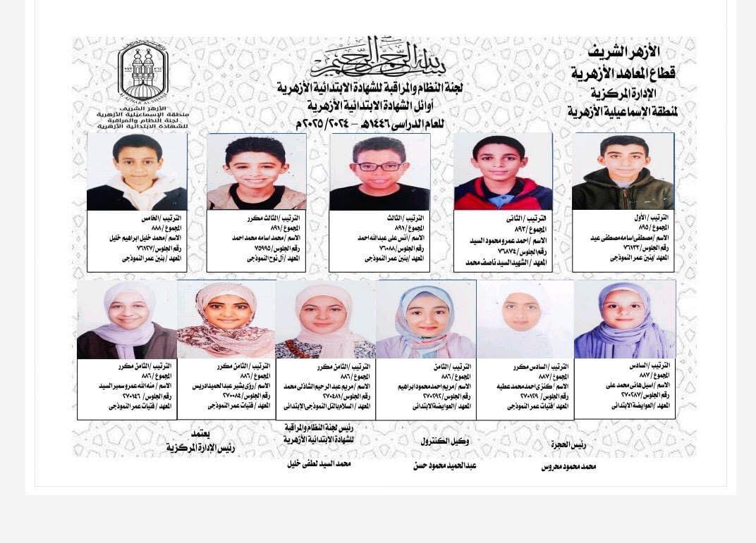 ننشر أسماء أوائل الشهادة الابتدائيه الأزهري في الإسماعيلية