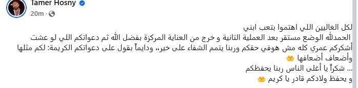 وكتب تامر عبر حسابه الرسمي على "فيسبوك" رسالة مؤثرة شكر فيها جمهوره على دعواتهم، قائلاً:"لكل الناس الغالية اللي اهتمت وسألت، الحمد لله ابني خرج من العناية المركزة بعد العملية التانية، وحالته مستقرة بفضل ربنا ثم بدعواتكم اللي عمري ما هوفيكم حقها، ربنا ما يوريكم وجع في أولادكم ويحفظكم ويحفظ أحبابكم جميعًا."