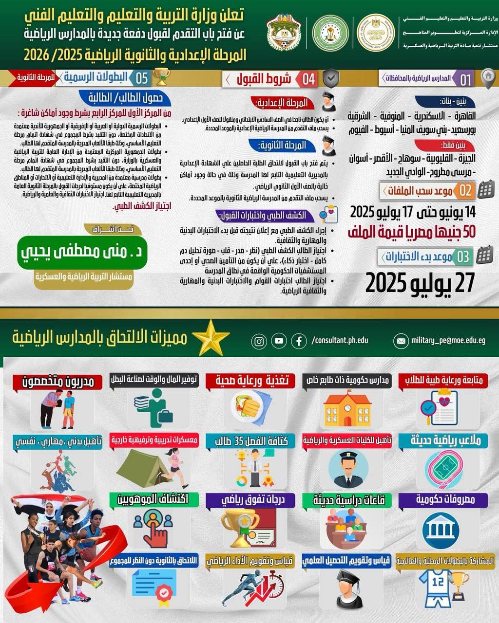 تفاصيل التقديم في المدارس الرياضية للبنين والبنات.. اعرف الشروط…أعلنت وزارة التربية والتعليم والتعليم الفني عن فتح باب التقديم للعام الدراسي ٢٠٢٥/٢٠٢٦ للالتحاق بالمدارس الرياضية في مرحلتي الإعدادية والثانوية (بنين وبنات)، اعتبارًا من السبت ١٤ يونيو ٢٠٢٥ وحتى الخميس ١٧ يوليو ٢٠٢٥، مقابل رسوم سحب ملف التقديم بقيمة ٥٠ جنيهًا.