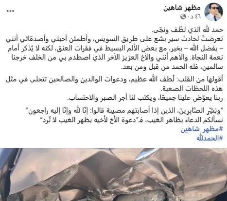 نجاة الشيخ مظهر شاهين من حادث سير على طريق السويس:"اللطف الإلهي أنقذني"