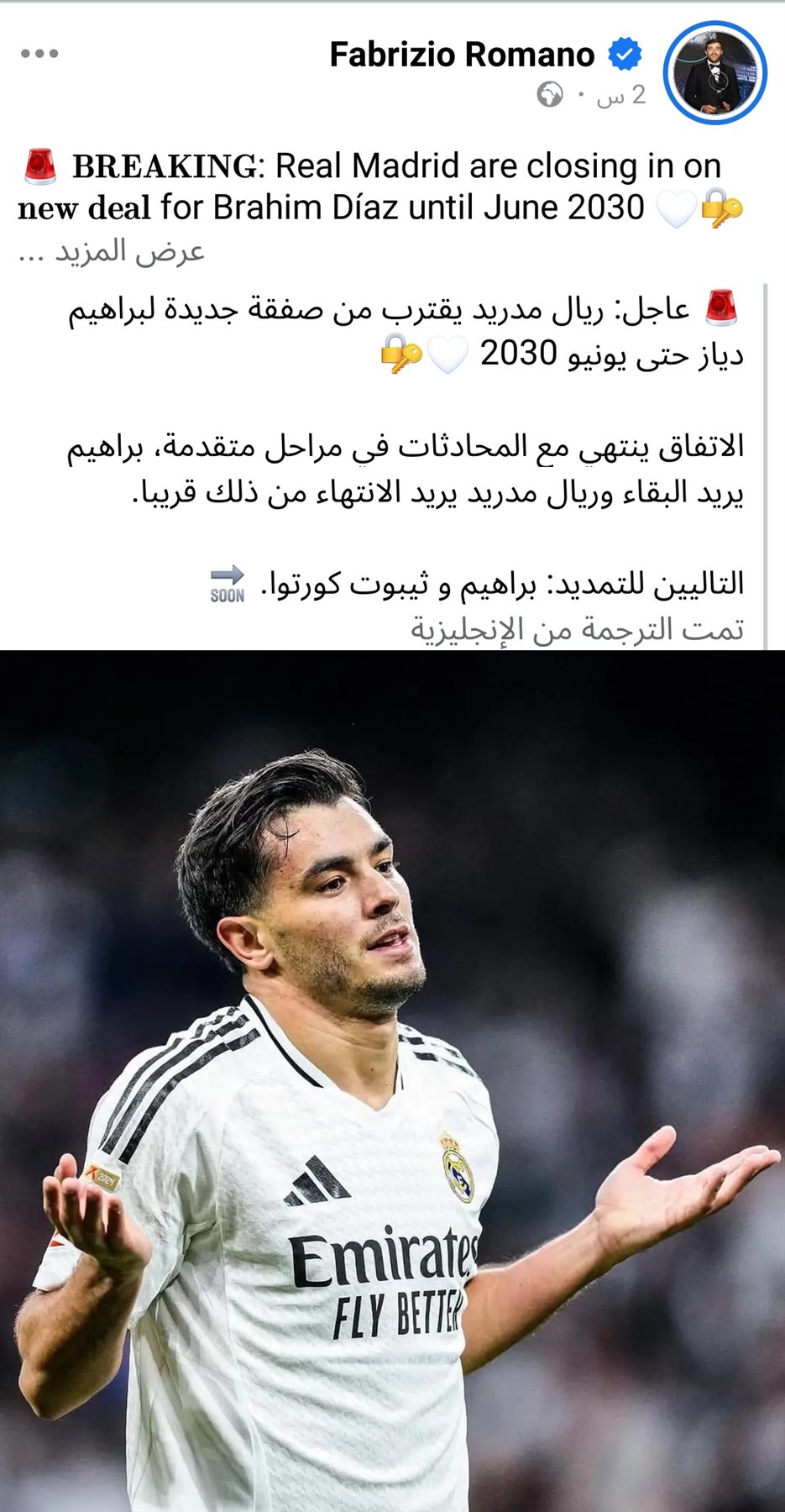 اقترب نادي ريال مدريد من التوصل لاتفاق نهائي مع اللاعب إبراهيم دياز بشأن تجديد عقده، وذلك بحسب ما أكده الصحفي الإيطالي الموثوق فابريزيو رومانو.