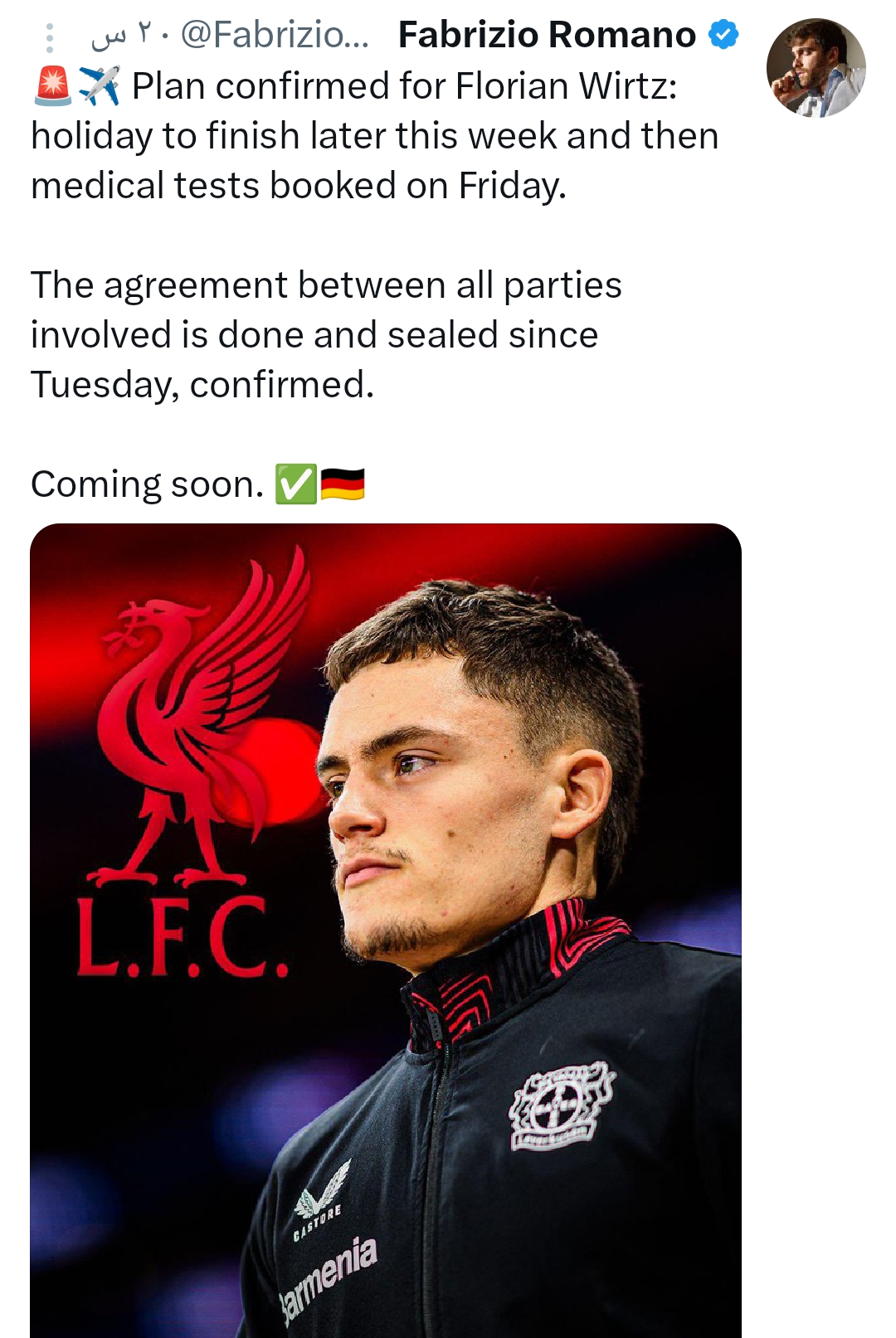 وبحسب التقارير المتداولة، فقد توصل ناديا ليفربول وليفركوزن لاتفاق على إتمام الصفقة مقابل 150 مليون يورو، شاملة الحوافز والمكافآت الإضافية، ما يجعلها واحدة من أغلى الصفقات في تاريخ النادي الإنجليزي.